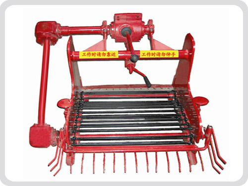 此薯類土豆收獲機是與手扶拖拉機相配套,一側(cè)力輸出(8-11馬力)拖拉機為動力,采用齒輪傳動,薯塊由輸送鏈輸送到機器尾部的震動側(cè)篩上,經(jīng)過篩動后滑落到機器前進方向的后側(cè)地面上以便收集。