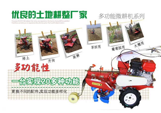 多功能微耕機安裝上不同的配件可以開溝、起壟、培土、打藥、播種、旋耕、松土、中耕、深耕、除草、施肥、噴藥殺蟲、噴淋、收割、鋪地膜、抽水澆地、開荒、發(fā)電、噴淋、打孔、碎草、根莖收獲、復土、開深溝、施底肥、偏培土、埋葡萄藤、扶壟、田間運輸?shù)龋c其他單一功能的多功能微耕機是不同的。多功能微耕機更是在國內(nèi)銷售到各個地區(qū)受到了廣大農(nóng)戶的一致好評。